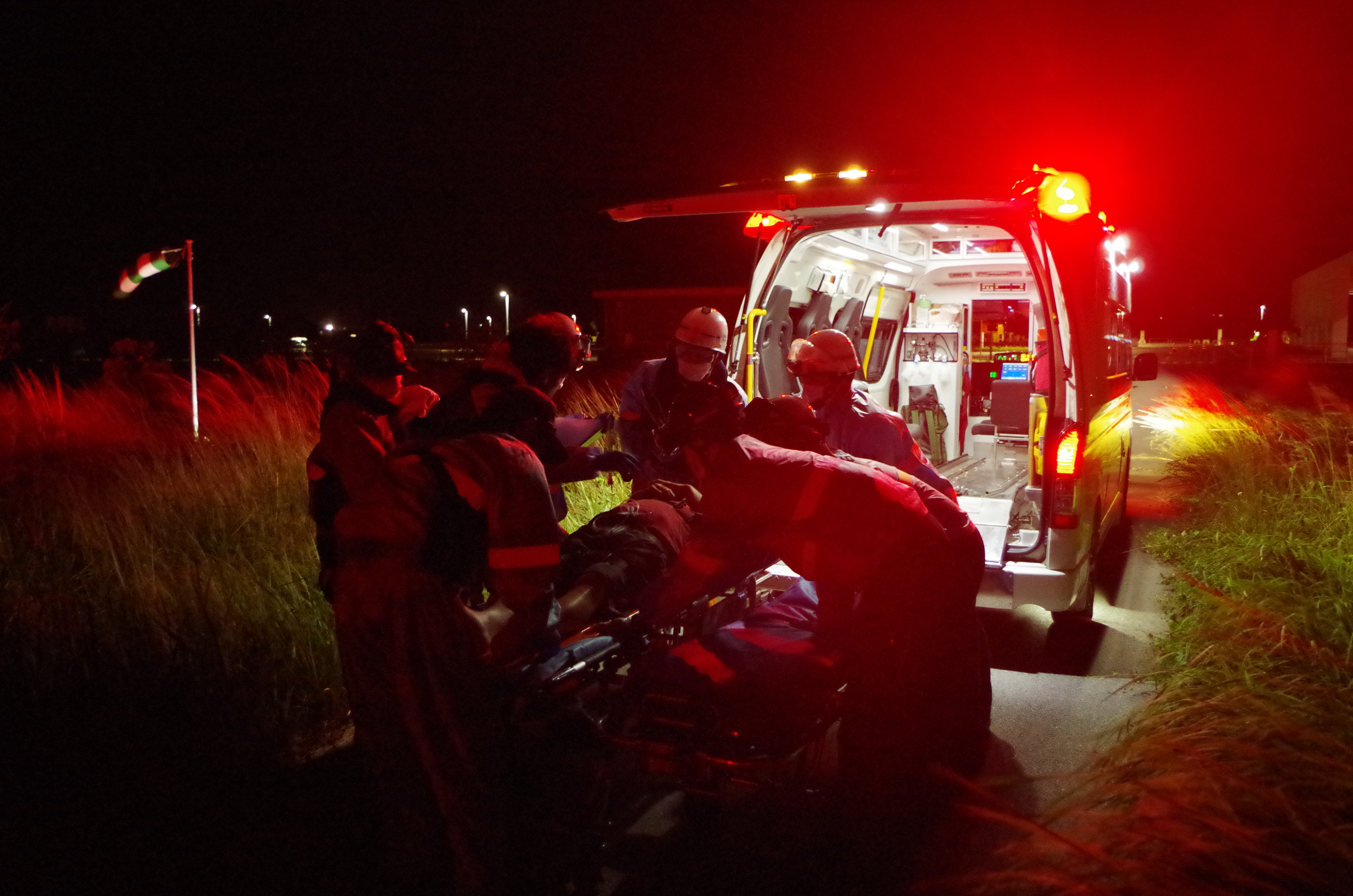多良間島からの急患搬送 令和5年12月21日午後9時13分、沖縄県防災危機管理課から当基地に対して急患輸送要請がありました。石垣航空基地所属ヘリコプターで多良間空港から真栄里暫定ヘリポートへの搬送を実施し、午後11時12分に石垣市消防本部の救急車に引き継いでいます。 患者68歳 男性 写真:真栄里暫定ヘリポートにて患者引継ぎの様子