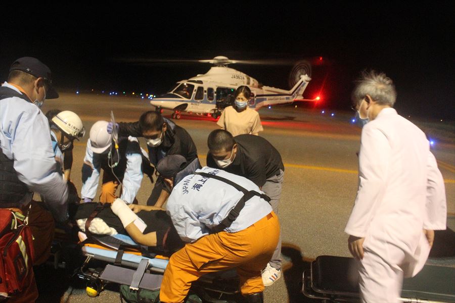 与那国島からの急患輸送 令和2年9月17日午後6時45分頃、沖縄県防災危機管理課より急患輸送要請がありました。石垣航空基地所属ヘリコプターで与那国空港から新石垣空港への搬送を実施し、午後8時50分に石垣市消防本部の救急車に引き継いでいます。 患者:51歳 男性 写真:与那国空港にて患者引き受け時の様子