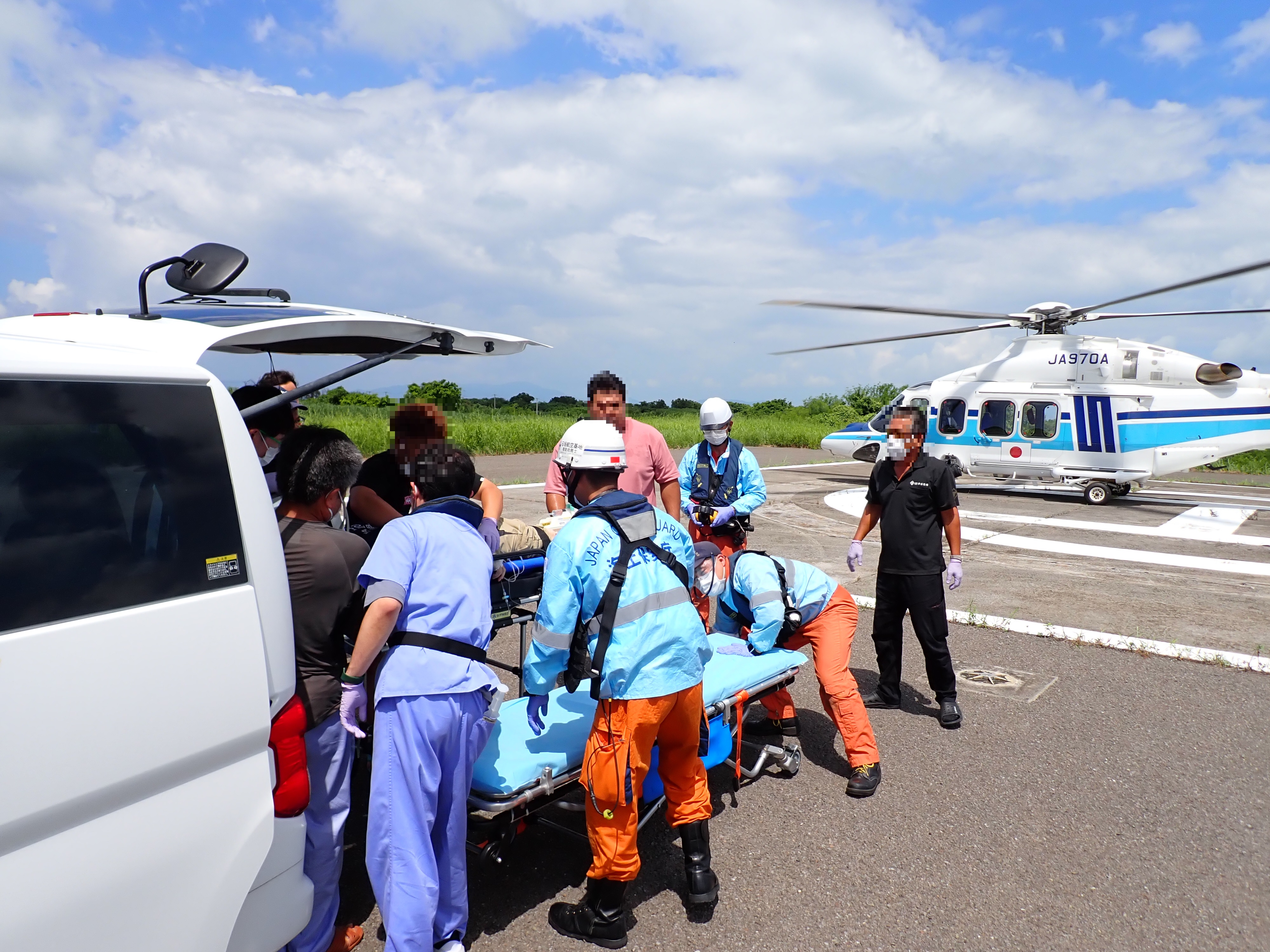 小浜島からの緊急搬送 令和6年8月11日午後12時48分、沖縄県防災危機管理課から当基地に対して急患輸送要請がありました。石垣航空基地所属ヘリコプターで小浜島HPから真栄里暫定ヘリポートへの搬送を実施し、8月11日午後2時45分に石垣市消防本部の救急車に引き継いでいます。 患者68歳 男性 写真:小浜島HPからの患者引き受けの様子