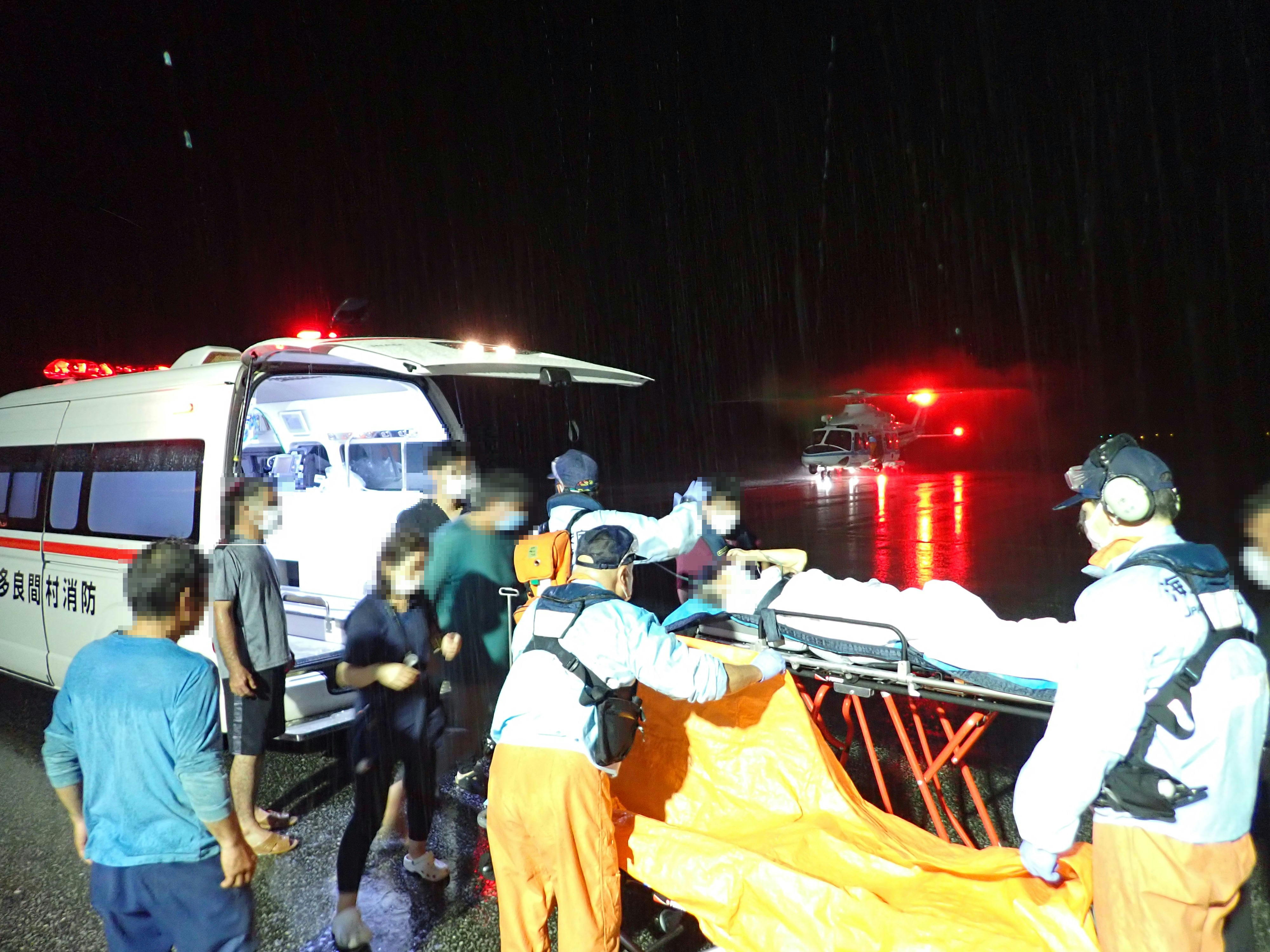 多良間島からの緊急搬送 令和6年11月14日午後11時42分、沖縄県防災危機管理課から当基地に対して急患輸送要請がありました。石垣航空基地所属ヘリコプターで多良間空港から真栄里暫定ヘリポートへの搬送を実施し、11月15日午前1時50分に石垣市消防本部の救急車に引き継いでいます。 患者80歳 男性 写真:多良間空港からの患者引き受けの様子