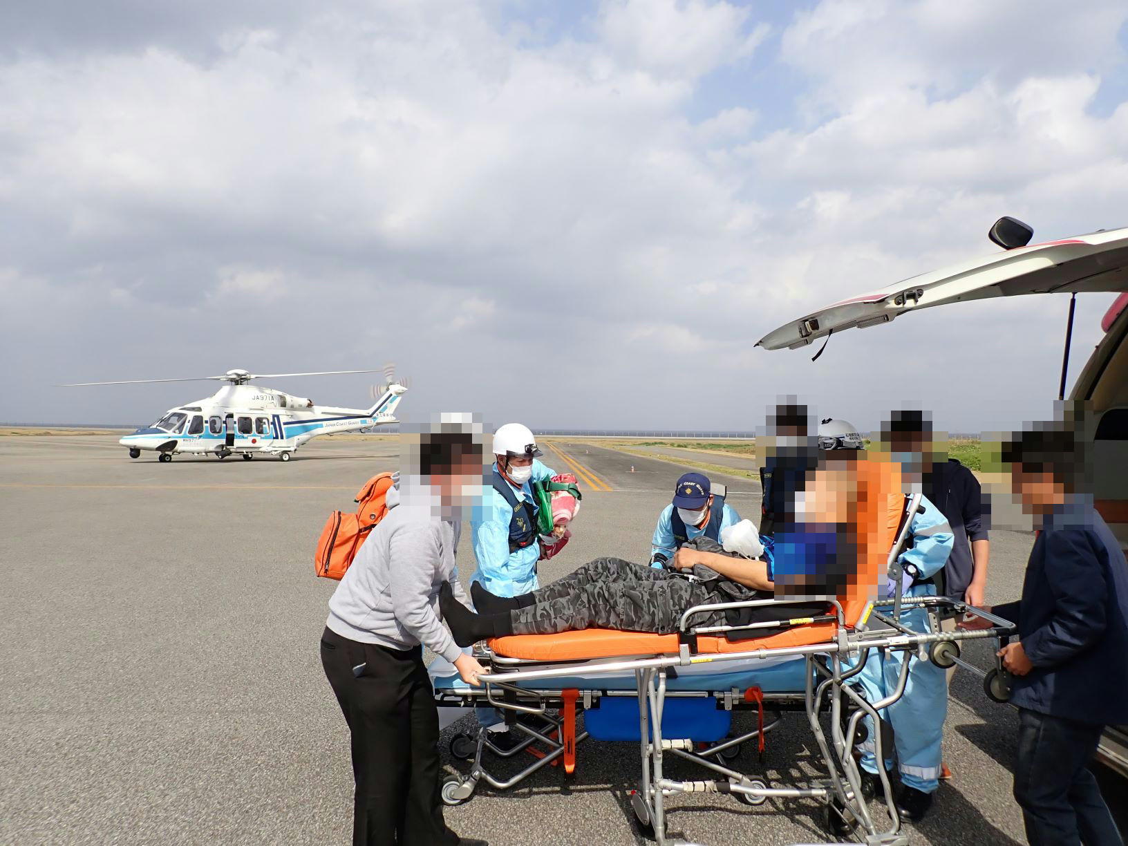 与那国空港からの緊急搬送 令和8年1月11日午前10時15分、沖縄県消防防災対策課から当基地に対して急患輸送要請がありました。石垣航空基地所属ヘリコプターで与那国空港から真栄里暫定ヘリポートへの搬送を実施し、1月11日午後0時47分に石垣市消防本部の救急車に引き継いでいます。 患者39歳 男性 写真:与那国空港からの患者引き受けの様子