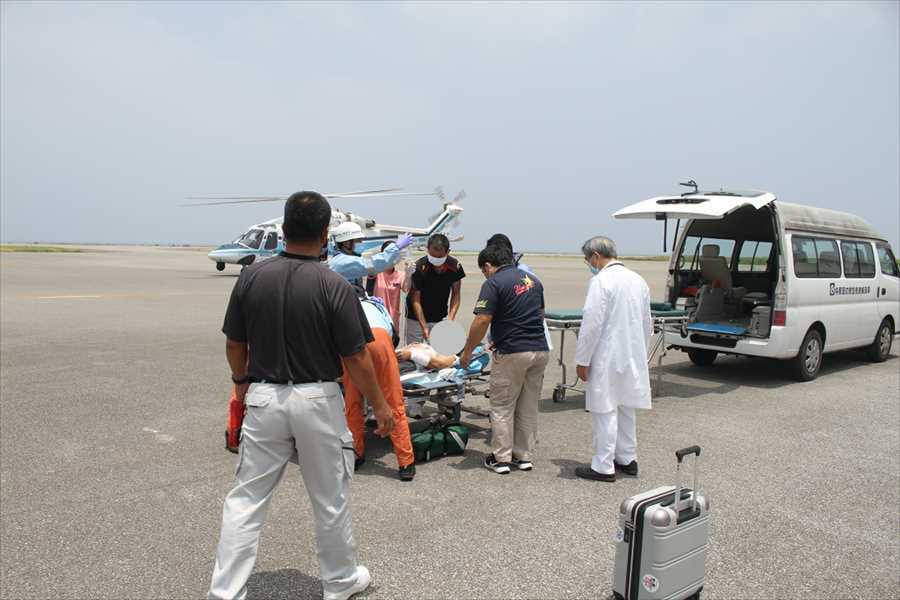 与那国からの急患輸送 令和2年8月6日午前11時52分頃、沖縄県八重山事務所より急患輸送要請がありました。石垣航空基地所属ヘリコプターで与那国空港から新石垣空港への搬送を実施し、午後1時32分に石垣市消防本部の救急車に引き継いでいます。 患者:73歳 男性 写真:与那国空港にて患者収容時の様子