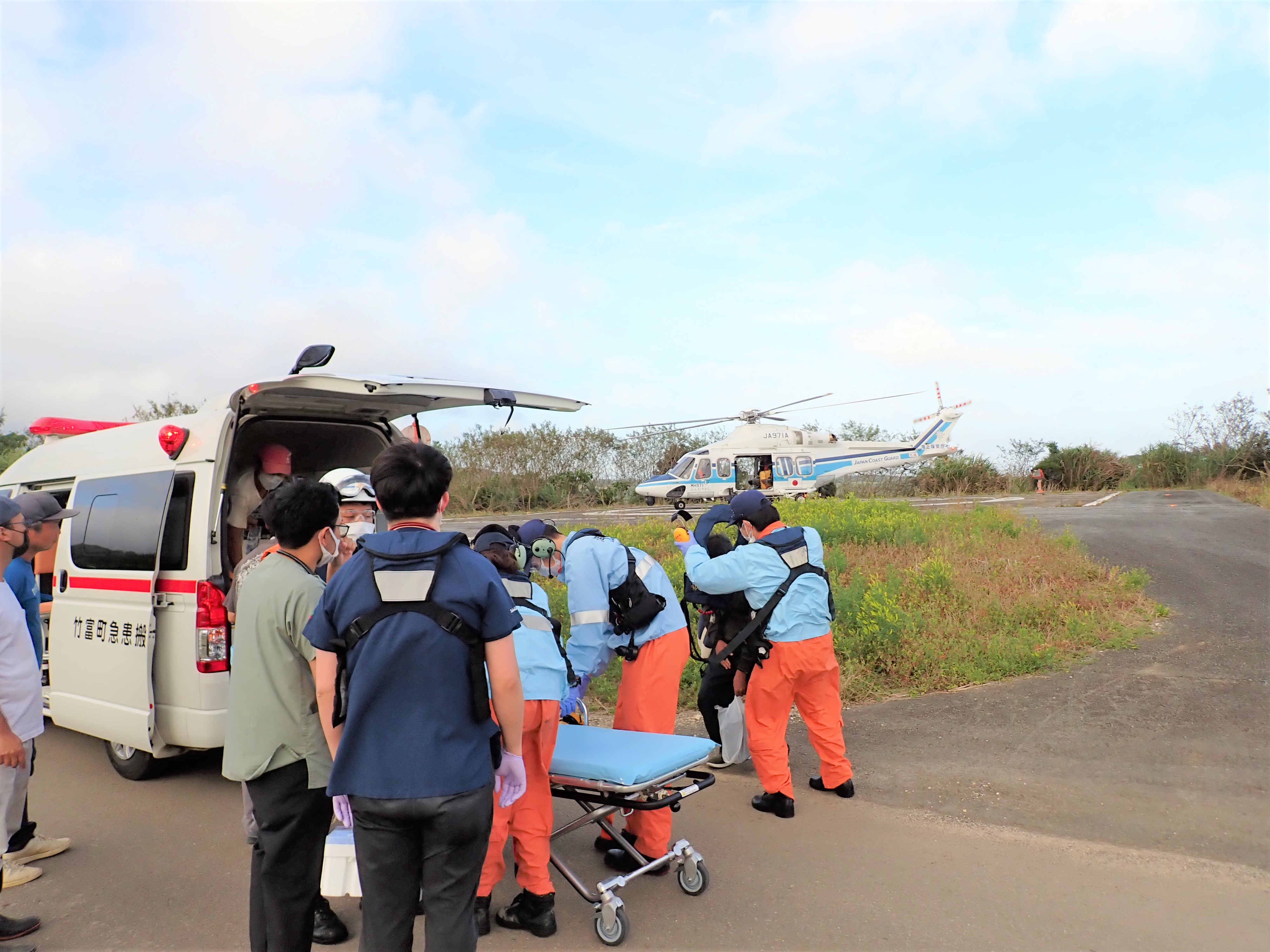 西表島からの緊急搬送 令和6年4月2日午後5時09分、八重山事務所から当基地に対して急患輸送要請がありました。石垣航空基地所属ヘリコプターで西表島東部ヘリポートから真栄里暫定ヘリポートへの搬送を実施し、4月9日午後6時13分に石垣市消防本部の救急車に引き継いでいます。 患者70歳 男性 写真:西表島東部からの患者引き受けの様子