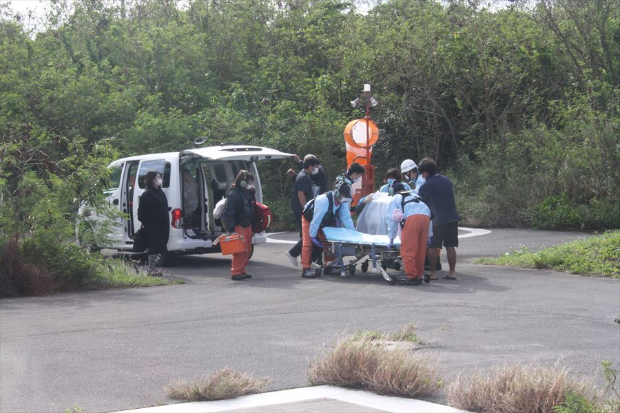 竹富島からの急患輸送 令和2年12月17日10時20分頃、沖縄県八重山事務所より急患輸送要請がありました。石垣航空基地所属ヘリコプターで竹富島ヘリポートから真栄里暫定ヘリポートへの搬送を実施し、11時08分に石垣市消防本部の救急車に引き継いでいます。 患者:33歳 男性 写真:竹富島ヘリポートにて患者引き受け時の様子
