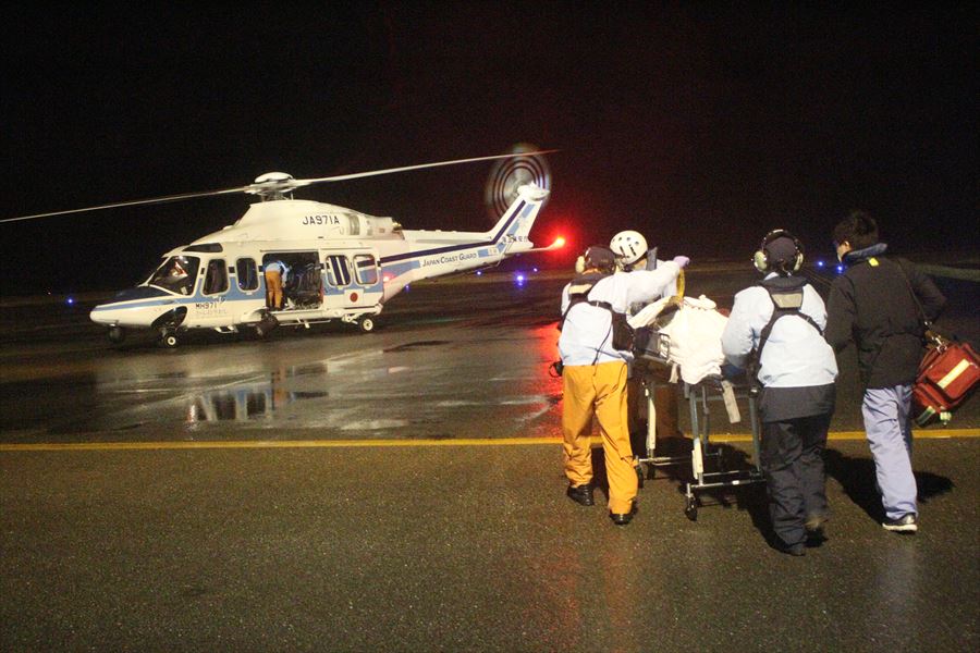 与那国島からの急患輸送 令和2年12月5日17時36分、沖縄県防災危機管理課より急患輸送要請がありました。石垣航空基地所属ヘリコプターで与那国空港から真栄里暫定ヘリポートへの搬送を実施し、20時28分に石垣市消防本部の救急車に引き継いでいます。 患者:77歳 女性 写真:与那国空港にて患者引き受け時の様子