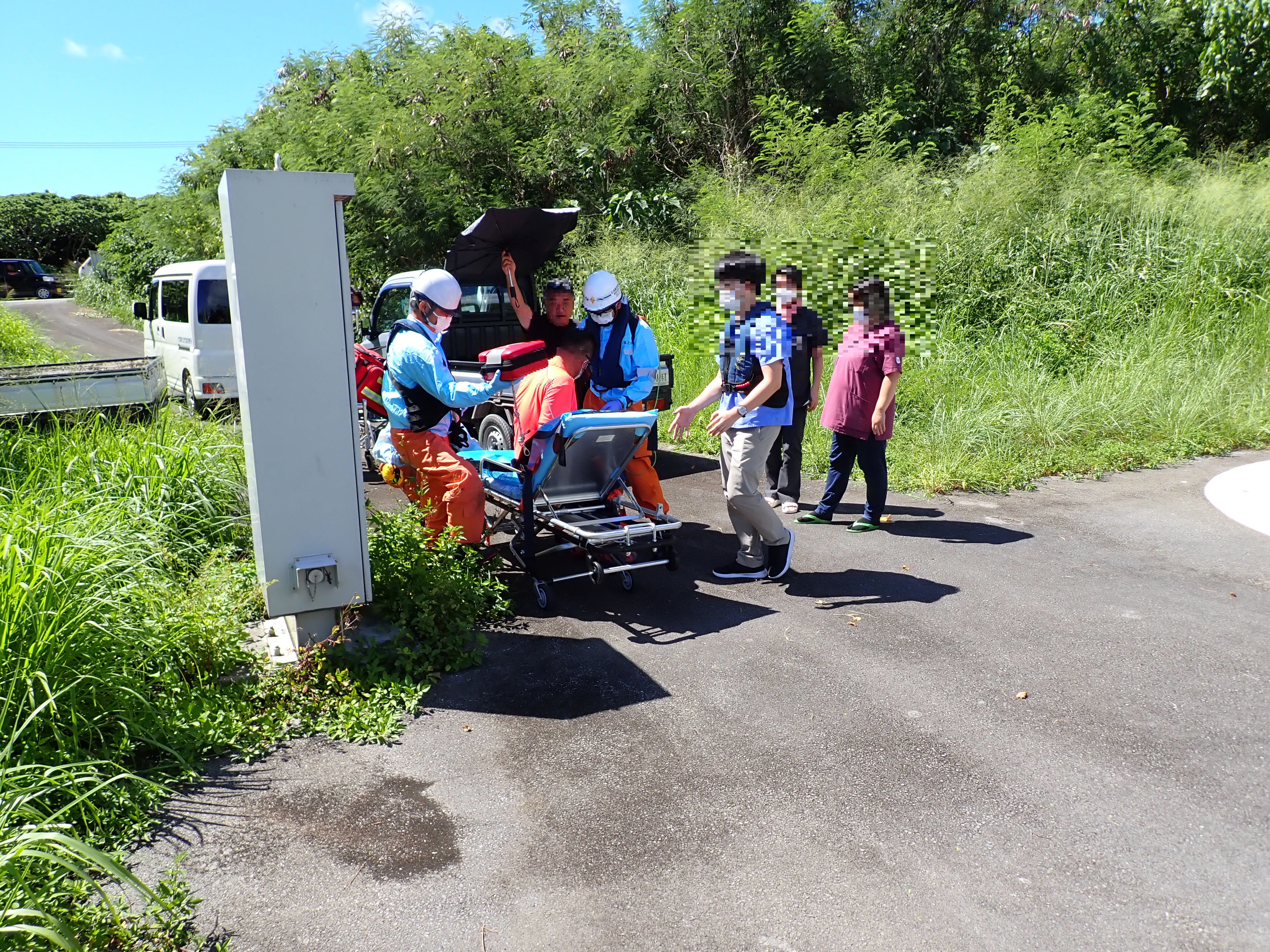 竹富島からの緊急搬送 令和6年7月4日午前9時56分、八重山事務所から当基地に対して急患輸送要請がありました。石垣航空基地所属ヘリコプターで竹富島ヘリポートから真栄里暫定ヘリポートへの搬送を実施し、7月4日午前10時43分に石垣市消防本部の救急車に引き継いでいます。 患者47歳 男性 写真:竹富島ヘリポートからの患者引き受けの様子