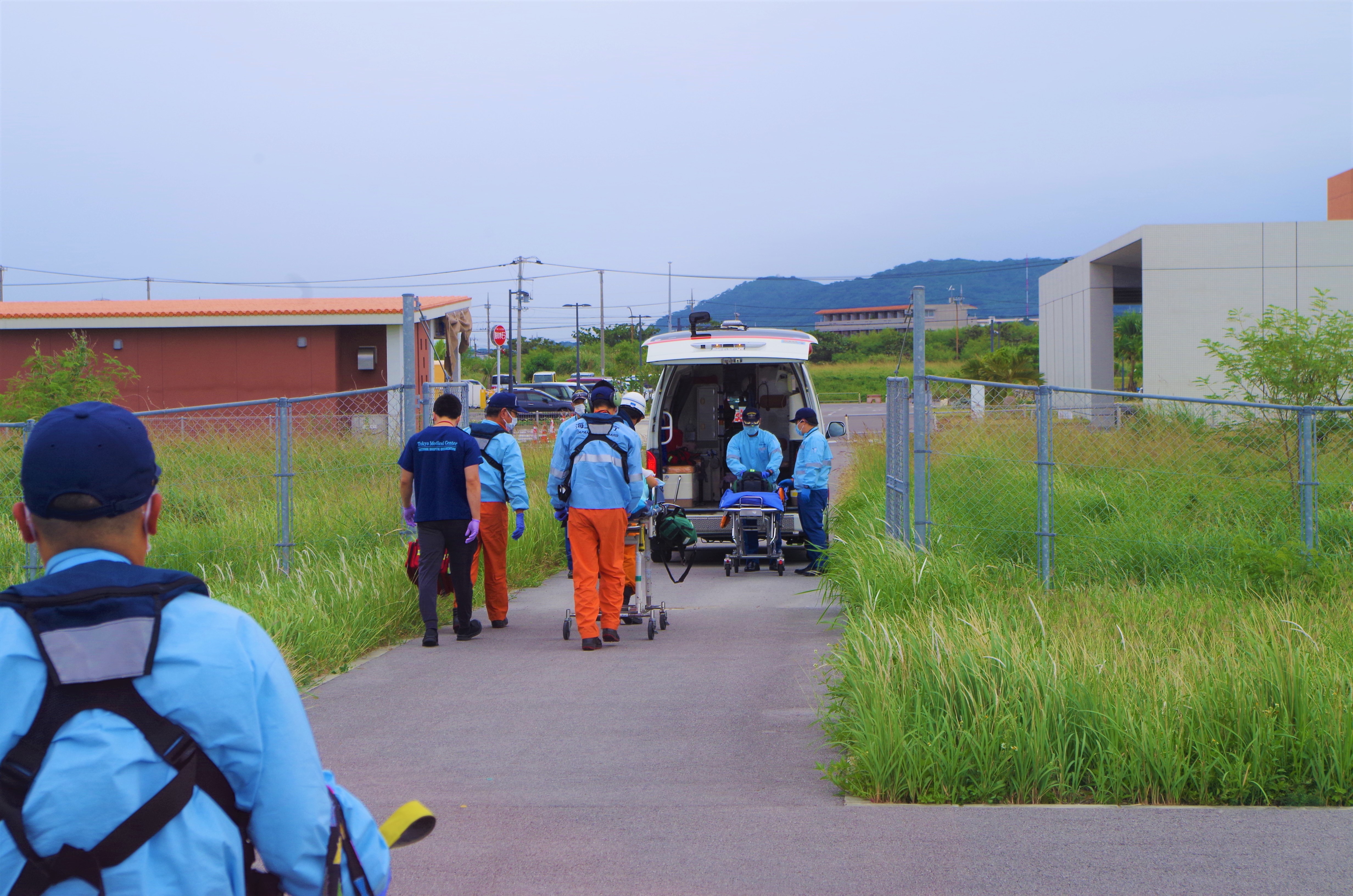 小浜島からの急患搬送 令和5年10月28日午前10時56分、沖縄県防災危機管理課より急患輸送要請がありました。石垣航空基地所属ヘリコプターで小浜島ヘリポートから真栄里暫定ヘリポートへの搬送を実施し、午後0時17分に石垣市消防本部の救急車に引き継いでいます。 患者71歳 男性 写真:真栄里暫定ヘリポートにて患者引き受けの様子