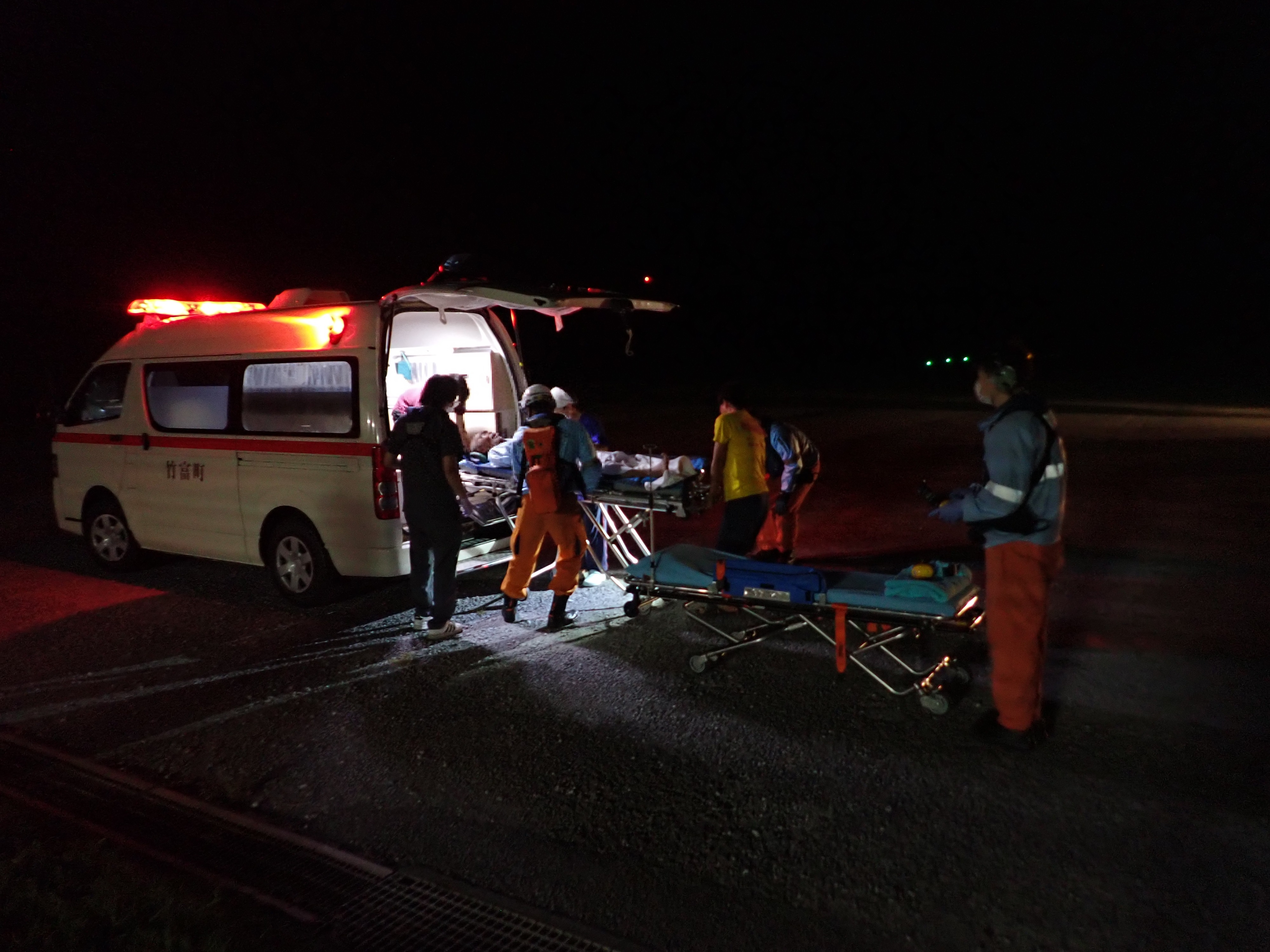 波照間島からの緊急搬送 令和6年8月7日午後7時50分、沖縄県防災危機管理課から当基地に対して急患輸送要請がありました。石垣航空基地所属ヘリコプターで波照間空港から真栄里暫定ヘリポートへの搬送を実施し、8月7日午後9時19分に石垣市消防本部の救急車に引き継いでいます。 患者85歳 男性 写真:波照間空港からの患者引き受けの様子