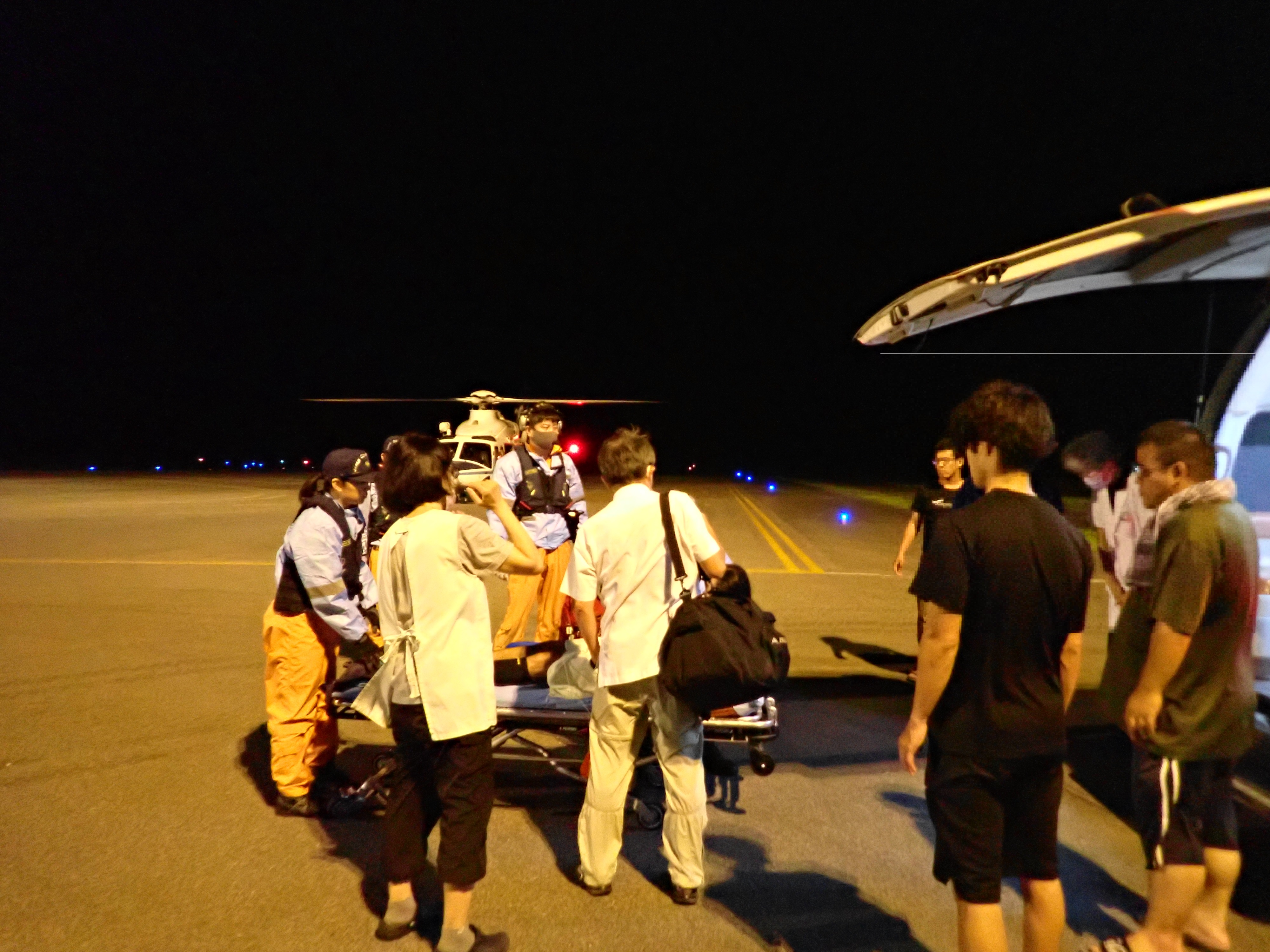 与那国島からの緊急搬送 令和6年7月6日午前零時17分、沖縄県防災危機管理課から当基地に対して急患輸送要請がありました。石垣航空基地所属ヘリコプターで与那国空港から真栄里暫定ヘリポートへの搬送を実施し、7月6日午前2時38分に石垣市消防本部の救急車に引き継いでいます。 患者32歳 男性 写真:与那国空港からの患者引き受けの様子