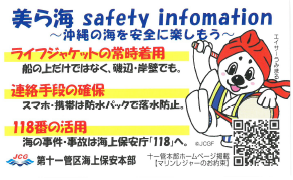 また、宮古島海上保安部では、本格的な海水浴シーズンを迎え、観光客の増加に伴い活発化するマリンレジャーによる人身・船舶の事故も増加することが予想されることから、上記機関を含めた8月31日(火)までの47日間を重点期間として、海難防止思想の普及・高揚を図ります。