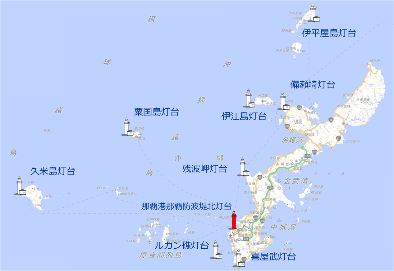 - [備考] 初代の灯台は、明治30年3月に設置され、昭和20年戦災被災し全壊しました。その後、米軍により灯台が再設置され、沖縄が本土復帰と同時に発足した第十一管区海上保安本部に移管されました。現在の灯台も米軍施設である伊江島補助飛行場内にあります。那覇保安部管内で米軍施設内に設置されている灯台は伊江島灯台のほかに2基あります。