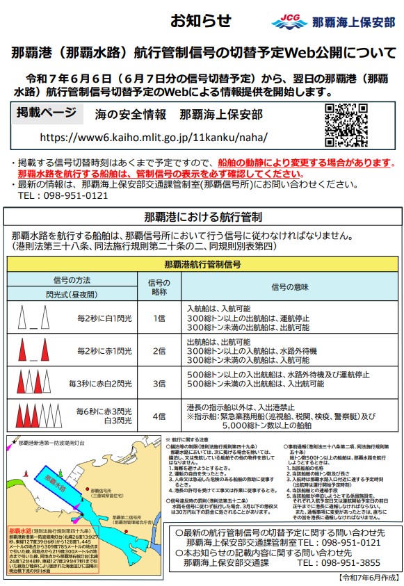 那覇港(那覇水路)航行管制信号の切替予定Web公開について 令和7年6月6日(金)から、翌日の那覇港(那覇水路)航行管制信号切替予定のWebによる情報提供を開始します。 掲載ページ 海の安全情報 那覇海上保安部https://www6.kaiho.mlit.go.jp/11kanku/naha/ 周知用リーフレットはこちら