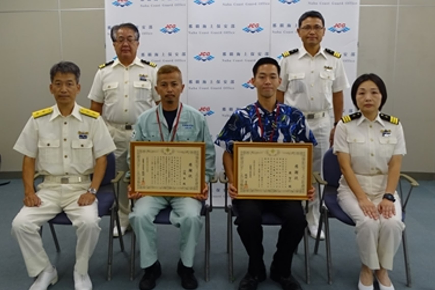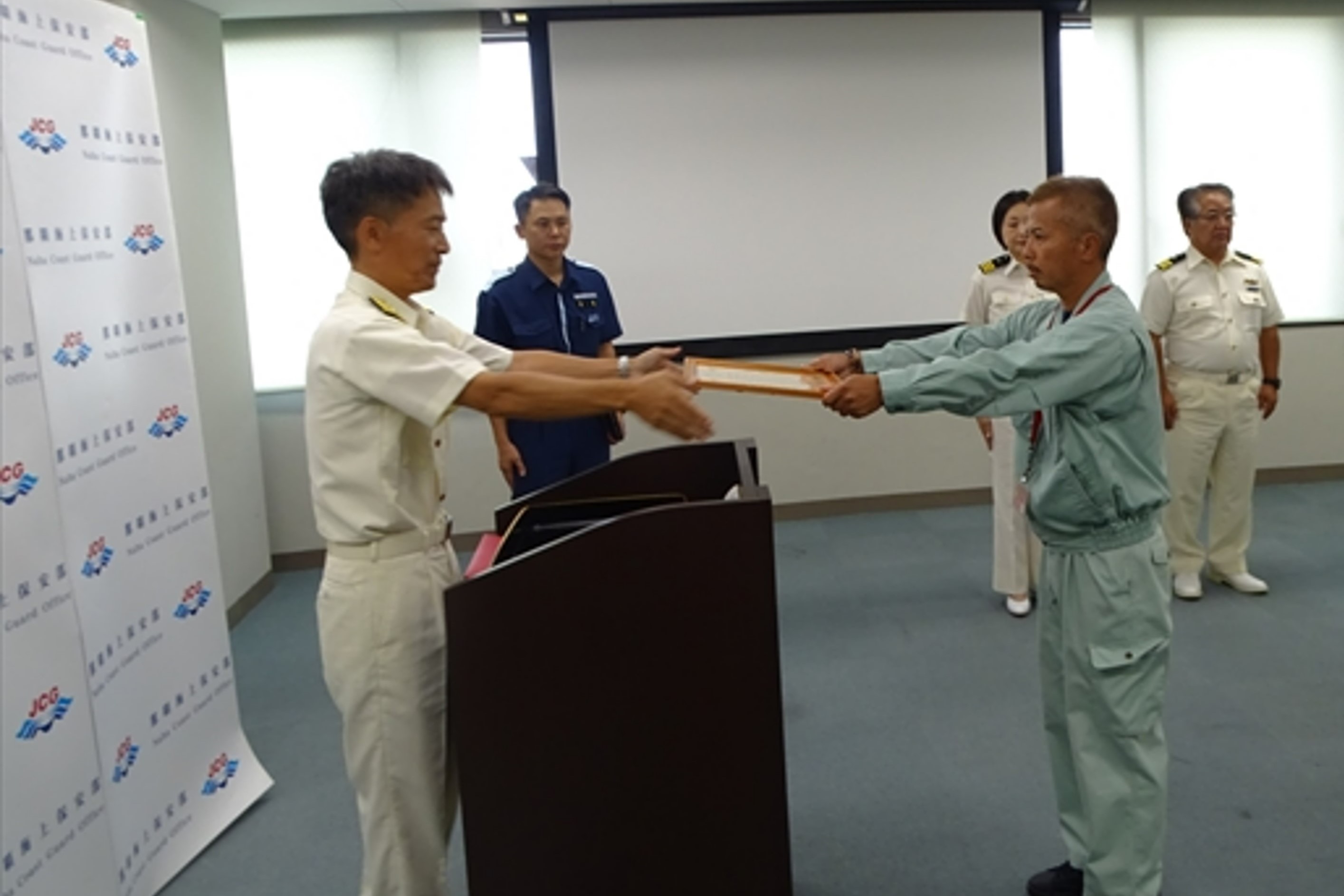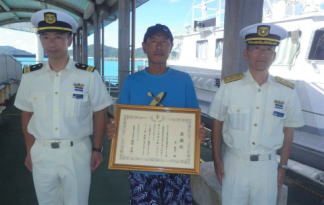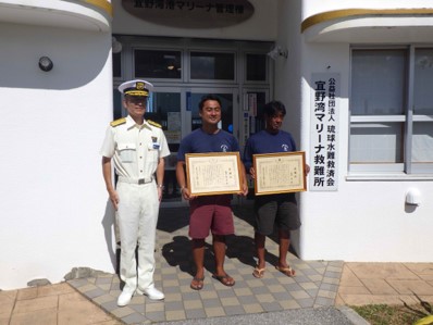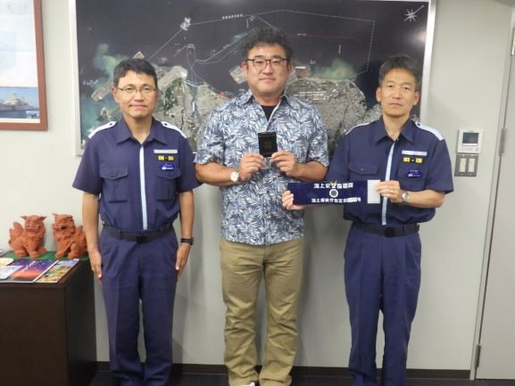 海上安全指導員として、新たに琉球ホテル&リゾート名城ビーチ事業部シニアマネージャーの浅野徹氏が指定されたことから、3月27に那覇海上保安部長から「指導員手帳」と「腕章」を交付しました。