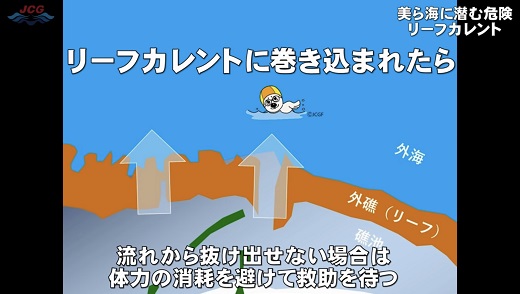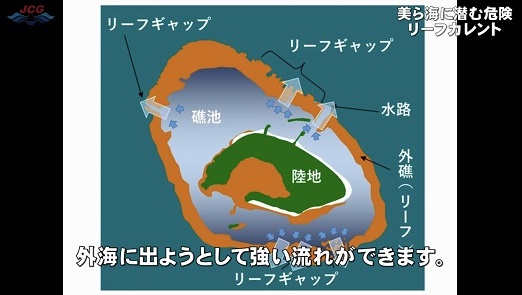 | リーフカレントはリーフ(reef。外礁とも言います。)に囲まれた池状の浅い海「イノー(礁池・しょうち)」で発生します。 満潮や高波によってイノーに入ってきた海水が、引き潮などによって外に出るとき、リーフの切れ目(リーフギャップ)に集まって、強い流れを生み出します。 ![]() この流れが離岸流であり、リーフにおいて発生する離岸流をリーフカレントといいます。 沖縄県内、そして中城海上保安部管内では、サーフィンやスノーケリングを含む遊泳中に、リーフカレントと思われる強い流れによって、陸岸に戻れなくなり、最悪の場合死亡・行方不明に至る漂流事故が毎年のように発生しています。 万一リーフカレントに流された際には、流れに逆らって泳ぐのはたいへん危険です。 リーフカレントの速さはおよそ秒速2メートル前後。 100メートル約50秒のスピードは、自由形競泳の世界記録に相当します。 つまり、オリンピック級のスイマーでも流れをさかのぼるのは困難で、いたずらに体力を消耗するばかりです。 ![]() 流れが弱まったタイミングで岸と平行に泳いで、流れを脱けてから岸に戻るか、泳力に自信がなければ無理をせずに、救助が来るまで浮いて待つことで体力の消耗を抑えてください。 そもそもリーフカレントに巻き込まれないように、引き潮の時間帯や波の高いときに海に入らないことも、予防策として大切です。 また、第十一管区海上保安本部では、リーフカレントによる事故があった場所やリーフが発達してリーフカレントが発生しやすい海域をホームページで公開しています。 ![]() 中城海上保安部が管轄している沖縄本島東海岸及び離島では、国頭村東岸や伊計島北東岸、宮城島東岸などの海域でリーフカレントへの注意を呼びかけています。 これらの海域は、監視員やライフセーバーが存在しない自然海岸がほとんどで、事故が起きたときの通報・救助の遅れも懸念されます。 このほか、リーフカレントによる漂流事故防止のため、海上保安庁では以下の対策も推奨しています。 ・監視救助体制の整った海水浴場での遊泳 ・複数での行動 ・万一の連絡ができるよう携帯電話の防水パックでの使用 ・ライフジャケットによる浮力の確保 リーフカレントについては、海上保安庁や第十一管区海上保安本部のホームページやYouTubeでも注意を呼びかけているので、こちらも参考にしてください。 沖縄の大地、そしてグスクも形成したサンゴがもたらすリーフカレント。 美ら海はただ美しいばかりでなく、その中に危険が潜んでいることを知ったうえで、 安全対策をとって、楽しく遊んでください。 ![]() なお、中城海上保安部も中城城も中城村も北中城村も同じ「なかぐすく」ですが、 中城海上保安部は中城村でも北中城村でもなく、沖縄市に所在することをお伝えしておきます。 (前身の中城海上保安署は中城村にありました。) ■ 資料画像出典/参考リンク先: ● 動画投稿サイトYouTube海上保安庁チャンネル 【海上保安庁】海難防止啓発アニメーション~動画でわかる海難防止!離岸流編~ (令和元年7月9日公開・第十一管区海上保安本部 製作) ● 第十一管区海上保安本部サイト内「リーフカレントに気を付けよう!」 ※発生海域マップは「4 注意海域をピックアップ!」をクリックしてください。 |