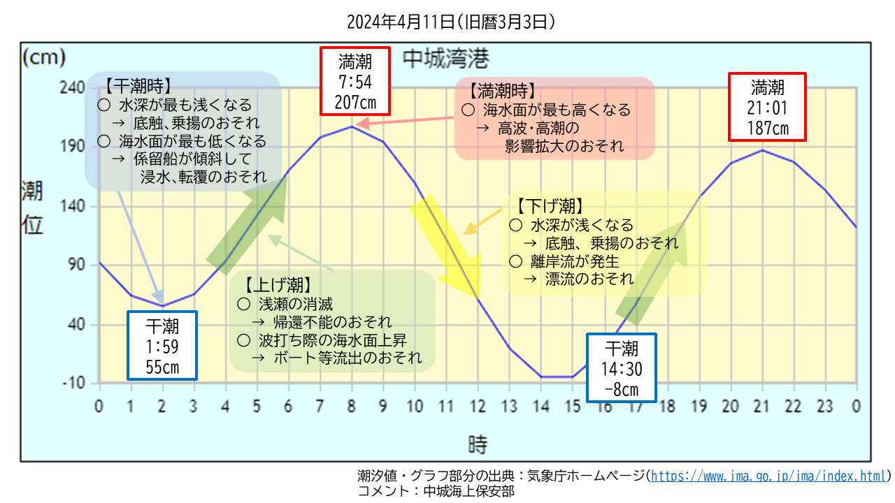 下げ潮による海水面低下のピークです。 水深が最も浅くなるため、カヤックやミニボート等が乗り揚げる事故や、船底を傷つけて浸水する事故が発生しやすくなります。 また、大潮の頃の沖縄では、満潮時と干潮時との潮位差は約2mとなります。 ボートやカヤック等の船舶を岸壁に係留する際にこの潮位差を考慮した余裕をもたせたないと、船体が宙づり状態になって傾いて、転覆・浸水に至るおそれがあります。 【上げ潮】 満ち潮とも言います。干潮時から満潮時にかけて徐々に海水面が上がり、これまで陸地だった浅瀬が徐々に消え、 潮干狩りや遊泳等では、陸岸まで戻れなくなる帰還不能事故が発生します。 遠浅の地形の多い沖縄の海岸では、広い範囲で急激に潮が満ちることがあるので、特に注意が必要です。 たとえ足首くらいの深さの浅瀬でも、深みや海藻に足をとられて転倒し、怪我や溺水のおそれがあります。 「潮が満ち始めたら陸岸へ戻る」のでなく、「潮が満ち始める頃には陸岸に戻っている」ことが大切です。 このほか、波打ち際も陸側へ広がっていくため、砂浜に置いた荷物やカヤック・ミニボート等が流されることがあります。 【満潮時】 上げ潮による海水面上昇のピークです。 海水面が上がることによって、リーフ(サンゴ礁)で囲まれた内海の多い沖縄の海では、 リーフを越えて波の打ち込みが増えるなど、風浪の影響が大きくなります。 特に、台風や地震・津波の自然災害が起こった時、 台風等による高潮の発生や津波の到達が満潮時に重なると、潮位や波高はさらに高くなり、陸地に浸水する危険が増します。 (潮の満ち引きに関係なく、台風・津波時に海や海岸に行くのは危険なので絶対にやめてください。) 【下げ潮】 引き潮とも言います。満潮時から干潮時にかけて徐々に海水面が低くなり、サンゴ礁や干潟などの浅瀬が陸地に変わり、 遠浅の地形の多い沖縄の海岸では、広い範囲を歩いて行き来できるようになりますが、 潮の満ち引きを把握しないで沖側へと進んでいくと、先に説明したように上げ潮になった時に戻れなくなるおそれがあります。 また、水深が浅くなることで、カヤックやミニボート、サーフボード等が海底に接触しやすくなります。 さらに、下げ潮のときには海水が沖へ向かうことによってリーフカレントが発生し、遊泳者やSUP等が流される事故が発生しています。 大潮の時期のリーフカレントは強い流れとなるので、特に注意が必要です。 以上のとおり、潮の満ち引きによって、さまざまな危険が生じます。 ハマオリなど潮干狩りを楽しむために、あらかじめ満潮や干潮の時刻、干満差を確認して 帰る時刻を事前に決めておくことや、潮が満ちる前に戻れる範囲で行動することが大切です。 そのほか、マリンレジャー事故防止のために以下の準備も大切です。 ● 雨・風など天気予報もチェックして無理のない計画を ● 台風接近時、地震・津波発生時はマリンレジャーの中止と海からの退避を ● 防水パック入り携帯電話等で連絡手段の確保を ● 万一の落水に備えてライフジャケットの着用を ● 事故の際には海上保安庁緊急電話118番へ連絡を なお、潮干狩り等で魚介類を採ることが、地元漁業者の漁業権を侵害する場合があります。 沖縄県では「沖縄県漁業調整規則」で何が違反かを定めているので、具体的な内容についてはこちらを確認してください。 ■ 参考リンク先: ● 潮汐を調べるには ⇒ 第十一管区海上保安本部ホームページ 潮汐推算 沖縄県 ⇒ 気象庁ホームページ 潮位表 沖縄(OKINAWA) ● リーフカレントについて詳しく知るには ⇒ 動画投稿サイトYouTube海上保安庁チャンネル 【海上保安庁】海難防止啓発アニメーション~動画でわかる海難防止!離岸流編~ (令和元年7月9日公開・第十一管区海上保安本部 製作) ⇒ 第十一管区海上保安本部サイト内「リーフカレントに気を付けよう!」 ※発生海域マップは「4 注意海域をピックアップ!」をクリックしてください。 |