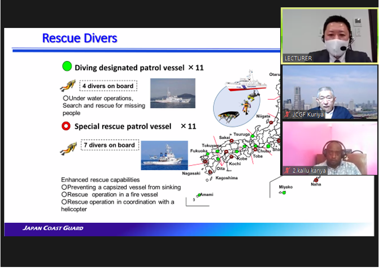 Although usually JICA invites participants to Japan for the "Maritime Search and Rescue and Maritime Disaster Prevention and Marine Environment Protection" and "Maritime Law Enforcement" courses of KCCP and conducted lectures, practical trainings and site visits, both courses have been conducted via online due to the influence of COVID-19 since last year.