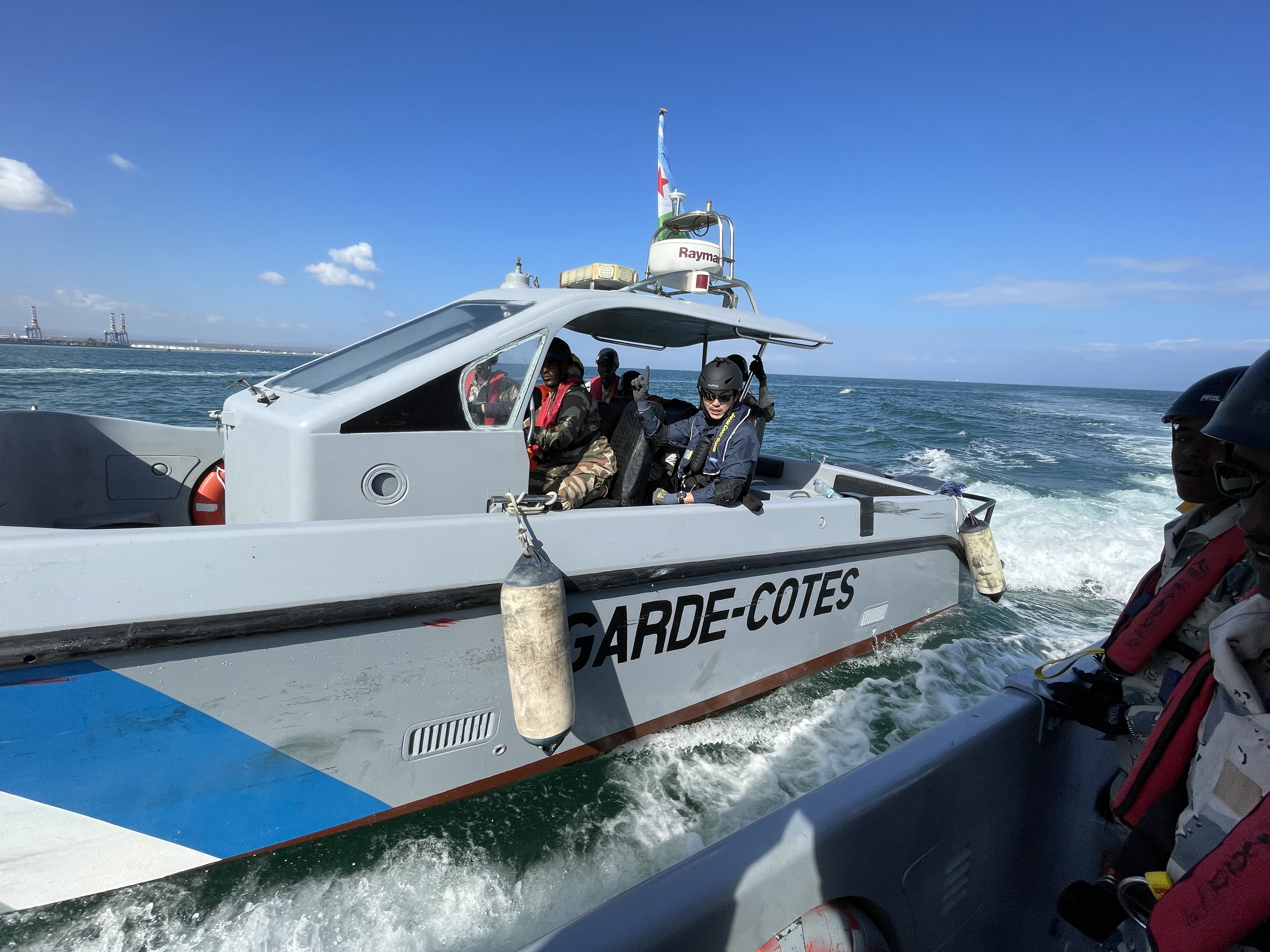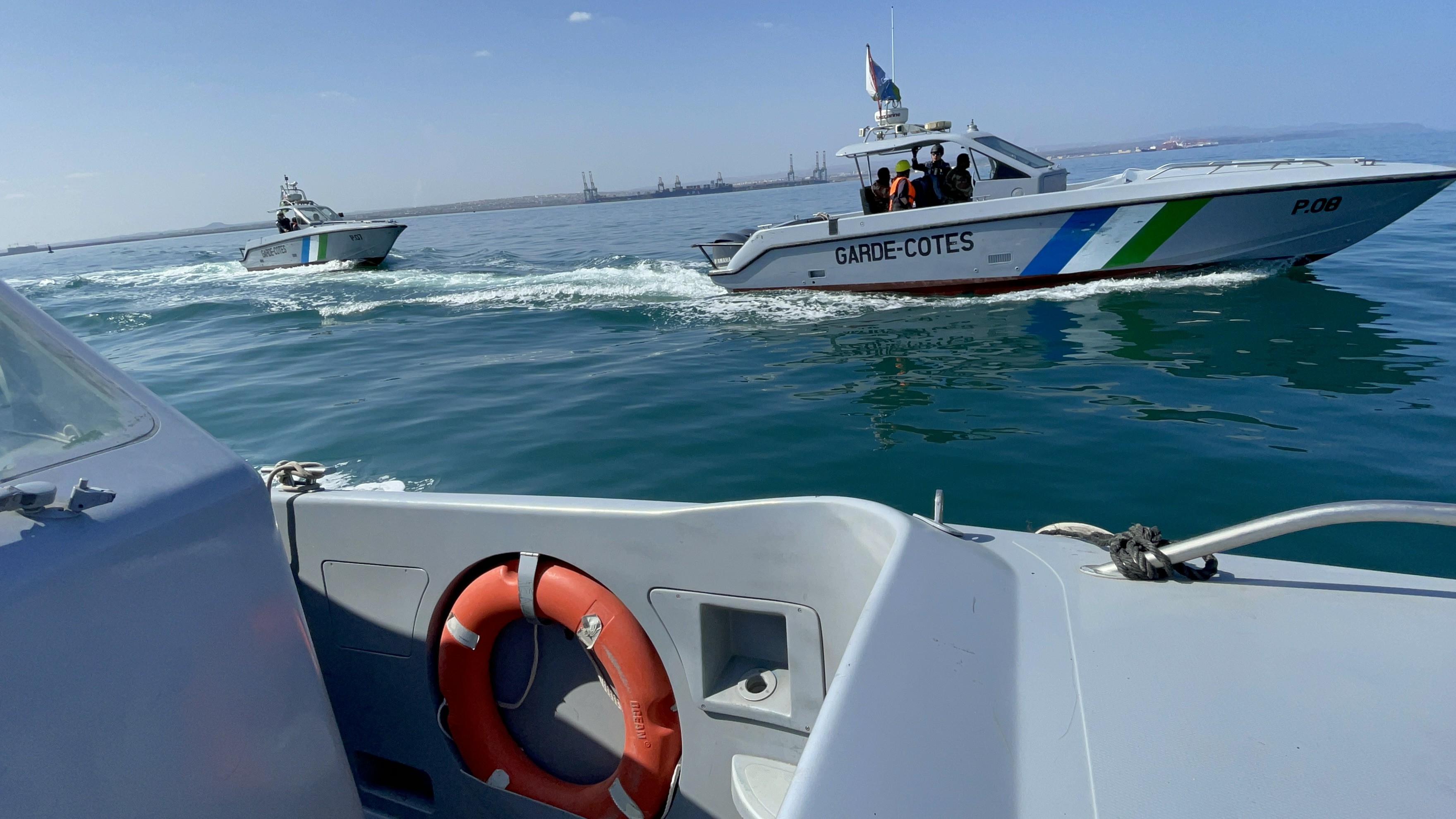 Participants from the Djibouti Coast Guard (DCG) used Rigid Hull Inflated Boats (RHIB) to intercept a suspected boat at high speed, stopped the boat, and then conducted onboard inspection repeatedly. This is the second RHIB training conducted for the DCG and the participants learned advanced boat maneuvering skills including quick turning at sea.