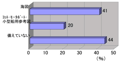 アンケート中、「あなたは、操船中に乗揚げの危険を感じ、ハッとした経験又は後々危険な海域を航行していたことに気づき、ゾッとした経験はありませんか。」との問いには、全回答者の50%が「ある」と答え、その原因として浅瀬や定置網の設置状況等の把握が不十分であったとしたものが最も多く、全回答者の23%であった。ところが、このような危険を避けるためには海図等による浅瀬等の確認が必要であるにもかかわらず、GPSを使用していること等を理由として海図等を備えていない者が44%(水上オートバイを除く。)であった(第2−3−1図参照)。
