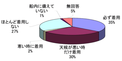 一方、事故発生の際に生存率の向上に有効な救命胴衣の着用状況については、全回答者の35%が必ず着用していると答えたものの、作業性の悪さや暑い等の理由によりほとんど着用しないと答えた者が27%であった(第2−3−2図参照)。
