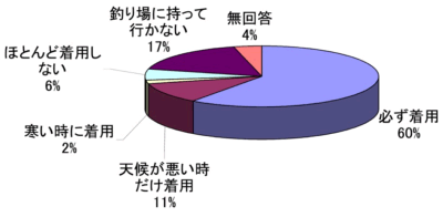 アンケート中、「どなたでも、磯釣り中にヒヤッとした経験が1度や2度はあると思いますが、それは次のうちどのようなものでしたか。」との問いには、予期しない波に突然襲われた(全回答者の18%)又は局地的な波の発生等磯の特性を知らなかった(同9%)等により釣り中に波に引き込まれ、又は引き込まれそうになった経験を全回答者の34%の者が有している。また、救命胴衣の着用状況については、全回答者の半数以上の60%が必ず着用すると回答している一方、ほとんど着用しない者は、釣り場に持って行かない者を含め23%に上っている(第2−3−4図参照)。