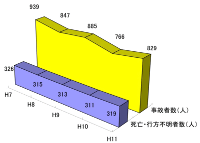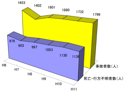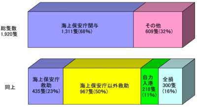 11年の要救助船舶は、1,920隻(10年1,726隻)、これに伴う遭難者は7,140人(10年7,840人)で、このうち死亡・行方不明者は146人(10年157人)であった。