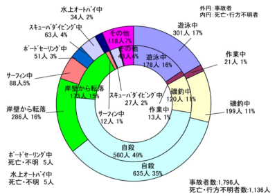 また、11年における海浜事故者数は1,796人(10年1,732人)で、このうち1,136人(10年1,130人)が死亡・行方不明となっている(第2−4−2図参照)。事故の内容別に見るとマリンレジャーに伴う海浜事故の事故者数は800人(10年741人)で、その死亡率(事故者数に対する死亡・行方不明者数の割合)は44%、その他の海浜事故等の事故者数は996人(10年991人)で、その死亡率は79%であった。