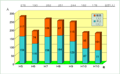海上保安庁は、洋上の船舶、離島等において救急患者が発生した場合、必要に応じて巡視船艇、航空機による患者、医師及び医薬品等の緊急輸送を行っており、11年は救急患者178人(第2−4−6図参照)、医師75人の緊急輸送を行った。