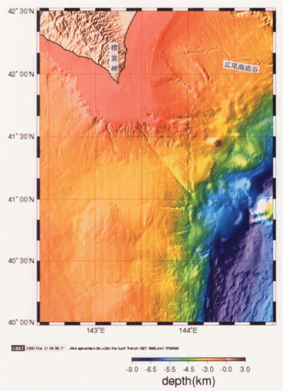 三宅島の調査 緊急火山情報を受けて、海上保安庁では危険な海域でも海底地形や海水の採取を行える無人調査艇「マンボウU」による調査を開始し、採取した変色水の分析を実施した。安全が確認されてからは測量船「昭洋」のマルチビームサイドスキャンソナーにより詳細な海底調査を行い、三宅島大鼻西方1.5kmにおいて、海底噴火の痕跡である火口3か所及び付近に多数の地割れを発見した。 また、三宅島と神津島にGPS受信機を設置して、地殻変動を連続的に監視し、三宅島験潮所が火山活動に伴い南南東方へ最大約38cm移動したこと、神津島験潮所が地震活動に伴い西方に最大約10cm移動したことを確認した。これらの調査・観測成果は、火山噴火予知連絡会に随時報告され、火山活動の推移を評価する資料として使用されている。 このほか、東京大学地震研究所及び海洋科学技術センターと共同し、三宅島から神津島にかけての海域に海底地震計20基を設置して観測を行っている(12年7月現在)。 マンボウU サイドスキャンソナーにより発見された海底の火口列 三宅島鳥瞰図 |