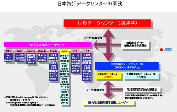 日本海洋データセンターは、国内的には我が国の海洋調査機関等から得られた海洋データの一元的な管理を行う「総合的海洋データバンク」である。また国際的にはIOCの推進する「国際海洋データ・情報交換システム(IODE)における我が国の代表機関」及びIOCの国際的なプロジェクトである西太平洋域共同調査(WESTPAC)等で収集された海洋データの管理に責任を持つ「責任国立海洋データセンター(RNODC)」である。
