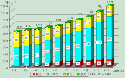 自然エネルギーを利用した航路標識は、11年度の新設及び改良改修によって166基増え、11年度末時点で5,534基ある航路標識中1,758基と32%を占めるまでになった。利用方法としては、風力発電、太陽光発電、波力発電を単独にあるいは複合的に使用している。