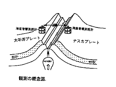 海底での精密な距離測定は、地震予知研究にとって重要と認められながらも長く実現できなかった。海上保安庁では、超音波技術を利用して海底面の水平距離を精密に測定する装置の開発を進め、東太平洋の深海底において地殻変動の長期観測に成功した。観測場所は、太平洋の東部を南北に走る東太平洋海膨と呼ばれる海底山脈で、太平洋を2分する2つのプレートの境界に位置する。2つのプレートは互いに離れるように運動するため境界部で海底の拡大が起こる。今回、東太平洋海膨頂部の2か所に音波の送受信機を設置して9年7月から426日間にわたって距離測定を繰り返した結果、2点間の距離が年間3cmの割合で収縮していることが判明し、プレート運動にともなう海底拡大が連続的ではなく間欠的に起こることが明らかになった。収縮のメカニズムは、拡大時に海底に現れた溶岩が海水により冷やされ、熱収縮が起こったと推定されている。