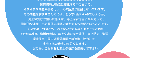一方、国際協力事業団を通じて多数の職員を海外に派遣し、捜索救助に関する技術指導を実施しているほか、積極的に近隣諸国と合同の捜索救助訓練を実施するなど、近隣諸国の捜索救助技術の向上にも貢献しています。