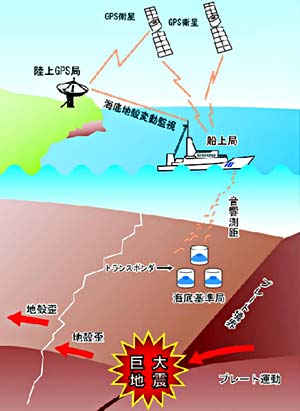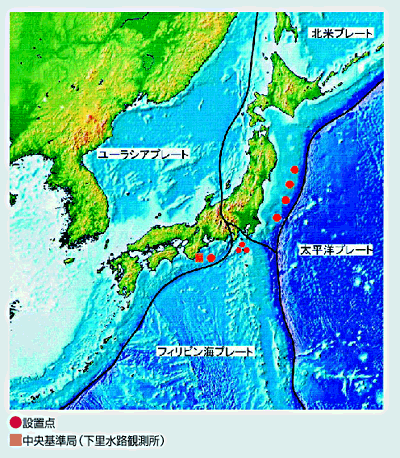 従来、海底のプレートの動きを直接観測する手段が無かったことから、海上保安庁は、東京大学と共同で海底の地殻変動を観測する技術を開発し、平成12年7月、太平洋プレートと北米プレートがぶつかり合う釜石沖を手始めに、プレート境界において海底基準局を設置し、海底地殻変動観測網の整備を開始しました。