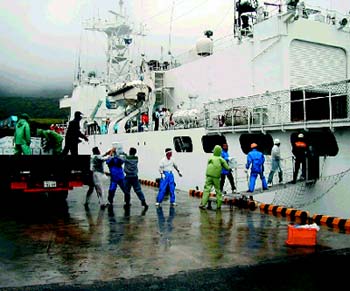 海上保安庁では、これらの自然災害に対し、本庁及び第三管区海上保安本部に対策本部を設置し、巡視船艇・航空機による被害状況調査、島民の緊急時島外避難対策、付近航行船舶に対して注意を喚起する航行警報の発出、東京都からの要請による関係職員・物資の輸送等を実施したほか、防災関係者の緊急時島外避難対策等の安全対策や三宅島に接近する不審船舶の監視警戒等の防犯対策のために、巡視船を三宅島付近海域に配備してきました。
