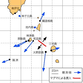 また、三宅島及び付近海域の火山活動に伴い、測量船により、精密な海底地形調査、海底地震計の設置及び地殻変動観測を実施しました。この結果、現在までのところ三宅島西方の大野原島が南に約64センチ、銭洲が西南西に約27センチ移動したことを観測したほか、周辺の島々も含め大きな地殻変動が生じていることを確認しました。