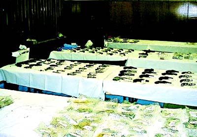 海上保安庁は、平成12年9月、沖縄県石垣島において、ヨットを使用して、けん銃86丁及び実包1,107発を密輸入した2名を銃砲刀剣類所持等取締法違反で緊急逮捕しました。この事犯は、海上保安庁が関与するけん銃押収事犯では、過去最高の押収量となりました。このほか、平成13年4月には、小樽港において、ロシア籍貨物船船内からけん銃20丁及び実包76発を発見、押収しました。