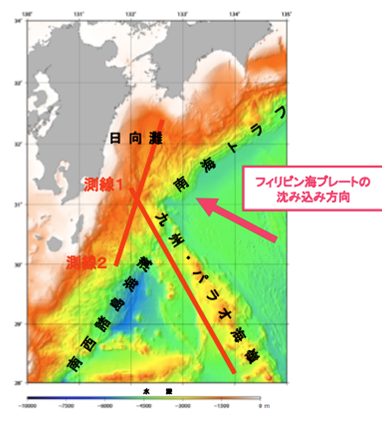 九州から南南東に九州・パラオ海嶺と呼ばれる海底の大山脈が伸びています。九州南方海域における海底地殻構造調査によって、日向灘の海底下にこの海底の大山脈が沈み込んでいる様子が捉えられました。本州および九州・南西諸島の南側ではフィリピン海プレートと呼ばれる岩盤が日本列島の下に沈み込んでおり、この沈み込みが東南海・南海地震などの巨大地震の原因であると考えられています。日向灘下に沈み込んでいる九州・パラオ海嶺の凸凹の形状がこの地震の発生の仕方に影響を与えているのではないかと考えられています。 |