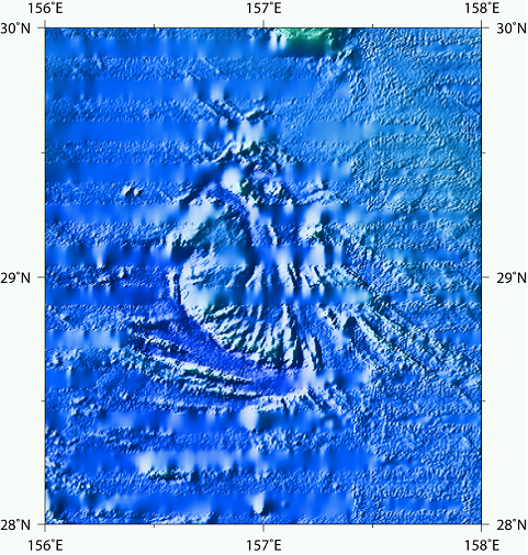人間の「へそ」に似た形状の特異な地形が、東京から東南東約1,800km、水深約6,500mの平坦な海底で見つかりました。直径約100km、高さ約1,000mのこの地形は、約1億5千万年前の現在の太平洋が遙か南米チリ沖で誕生した頃に海底が押し合い引き合いしてできたもので、それが長い時間をかけて現在の地点まで悠久の旅を続けてきたものと考えられます。最新の調査機器を用いて我が国周辺の調査をしていると、時折、このように極めて珍しい地形を発見することがあります。 |