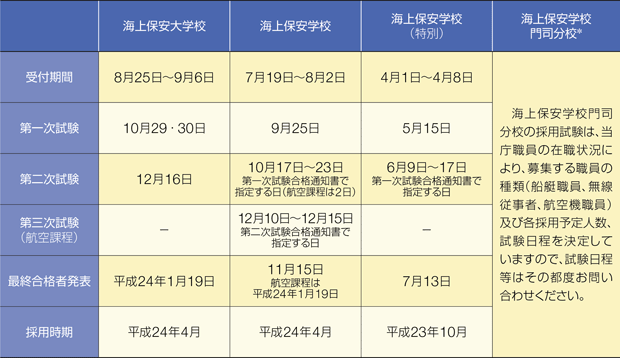 | 海上保安学校 | 昭和63年4月2日以降生まれで高校卒または平成24年3月までに高校卒業見込みの者など |