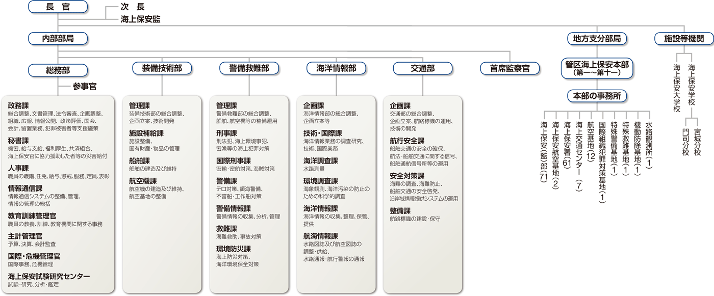 海上保安庁は、国土交通省の外局として設置されており、本庁(東京都)の下、日本全国に管区海上保安本部、海上保安部等を配置し、一元的な組織運用を行っています。