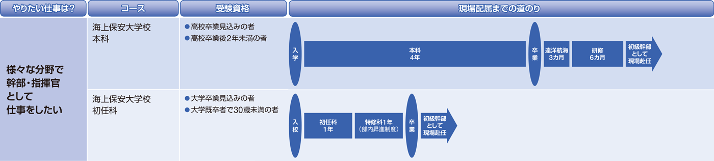 ほとんどの海上保安官は、大学校・学校を卒業後巡視船艇に配属されます。その後は、経験をつみながら、自分の適性や希望に応じて様々な研修を受けることで、それぞれが目指す道に向けてキャリアアップを図っていきます。