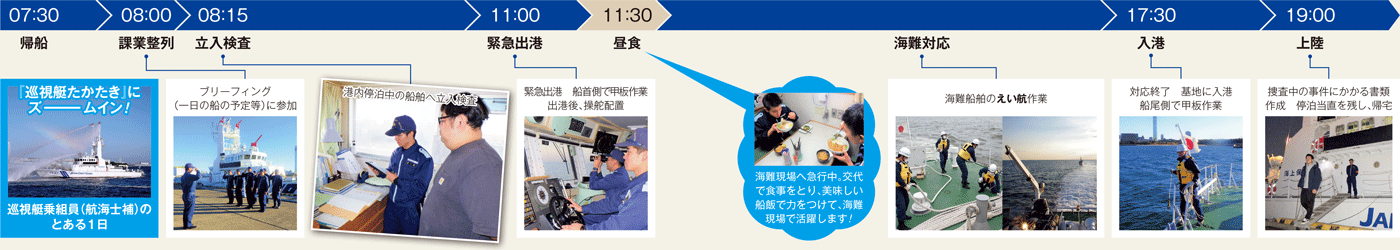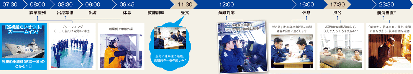 *大型の巡視船は、出港後24時間体制でしょう戒等を行うため、乗組員は交代で航海当直にあたります。基本的には0〜4時と12〜16時勤務、4〜8時と16〜20時勤務、8〜12時と20〜24時勤務の三交代制です。