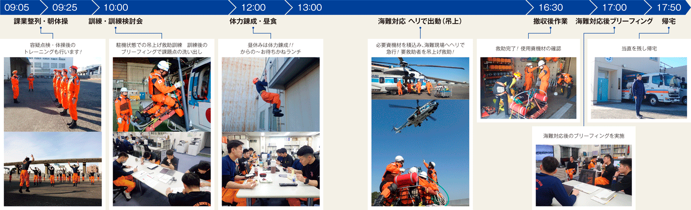 航空員として固定翼機では捜索や不審船の写真撮影、物件投下等の業務を行い、回転翼機では捜索や見張り等の業務を行うとともに、吊上げ救助時には要救助者を機体に引き込んだりといった海難救助作業にも従事しています。