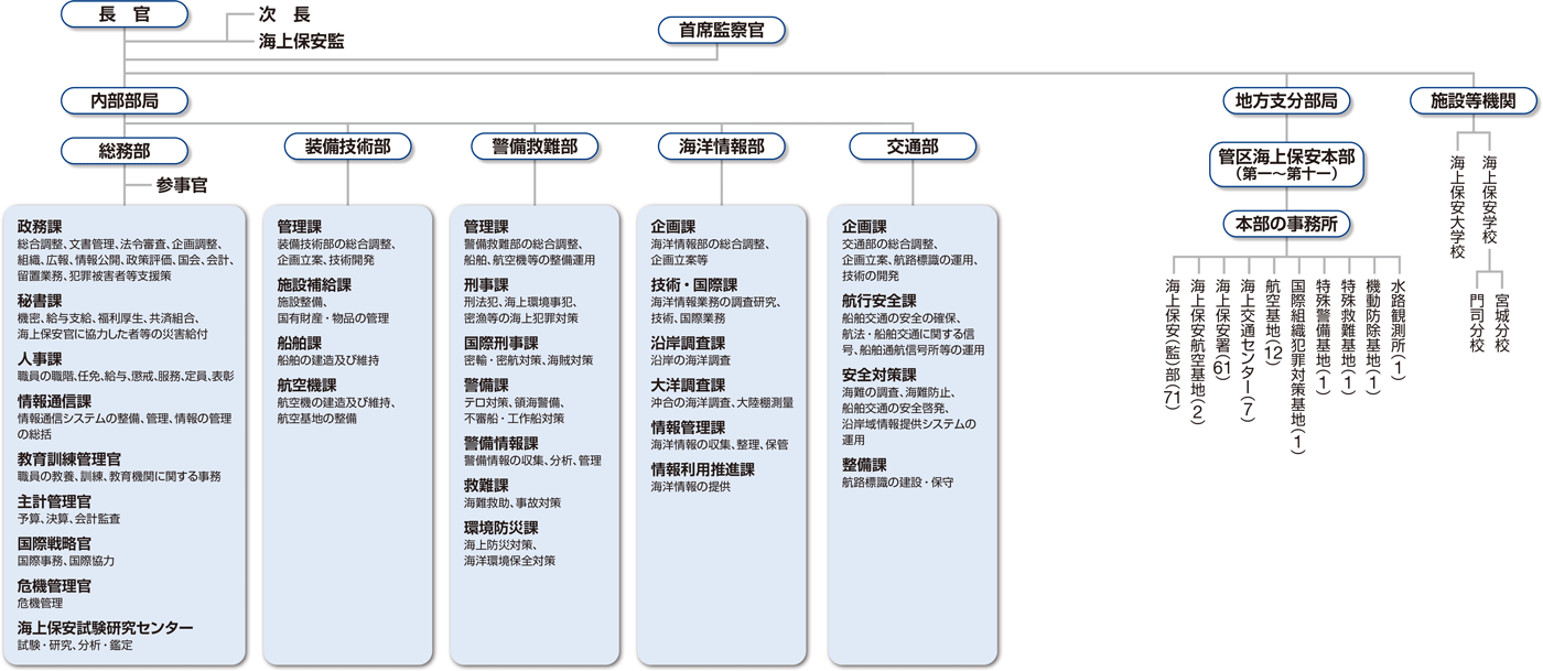 海上保安庁は、国土交通省の外局として設置されており、本庁(東京都)の下、日本全国に管区海上保安本部、海上保安部等を配置し、一元的な組織運用を行っています。