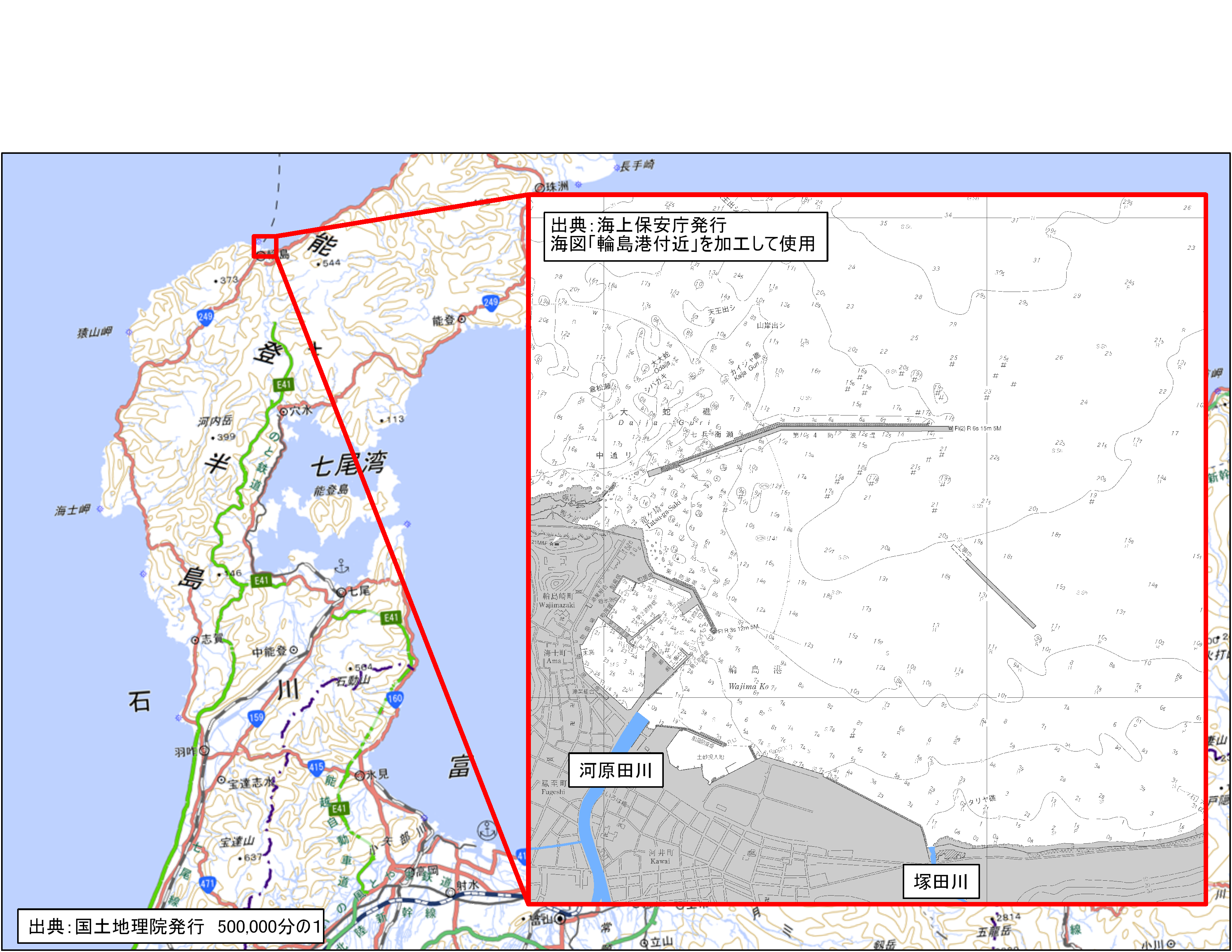 輪島港では令和6年1月1日に発生した能登半島地震(以下、地震)により、海底が約1~1.5 m隆起したと報告されています(参考2)。また、輪島市北方沖でも当庁の調査により、約3 mの海底の隆起が確認されるなど(参考3)、豪雨以前の地震の影響によって、広範囲に大きな水深変化が生じています。