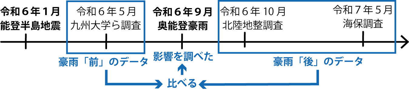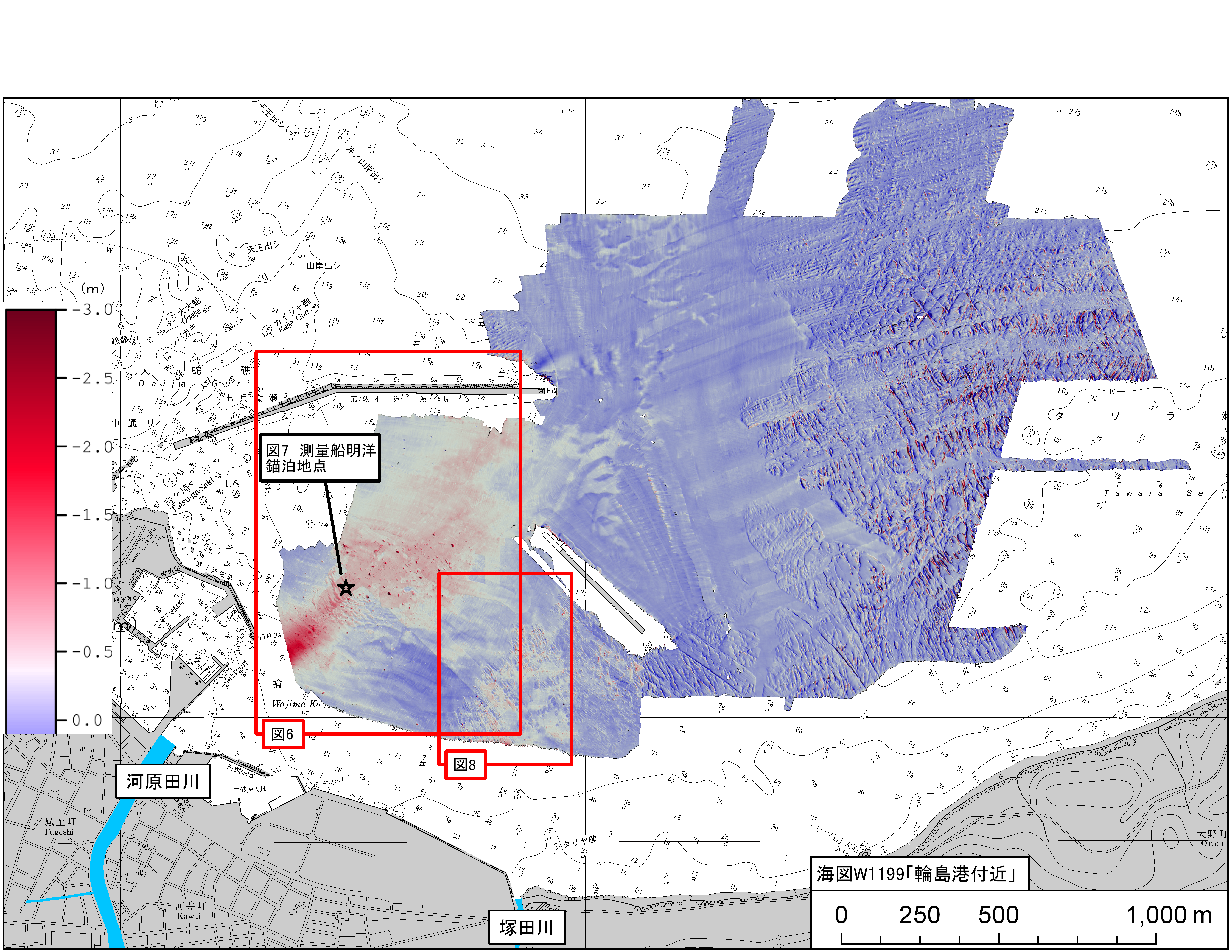 - 河原田川河口沖では、土砂の堆積により、地震後の水深から最大1.8m浅くなり、大きさが数mの巨礫や人工物が多数散在していることが確認されました(解説コラム図6へ)。豪雨の影響により、河口の延長上では、地震の隆起を超える規模の土砂の流入・堆積が起こったことが明らかとなりました。