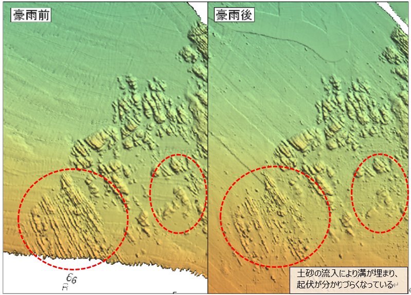図6 河原田川の河口沖の豪雨前後の海底の様子(左:豪雨前、右:豪雨後)