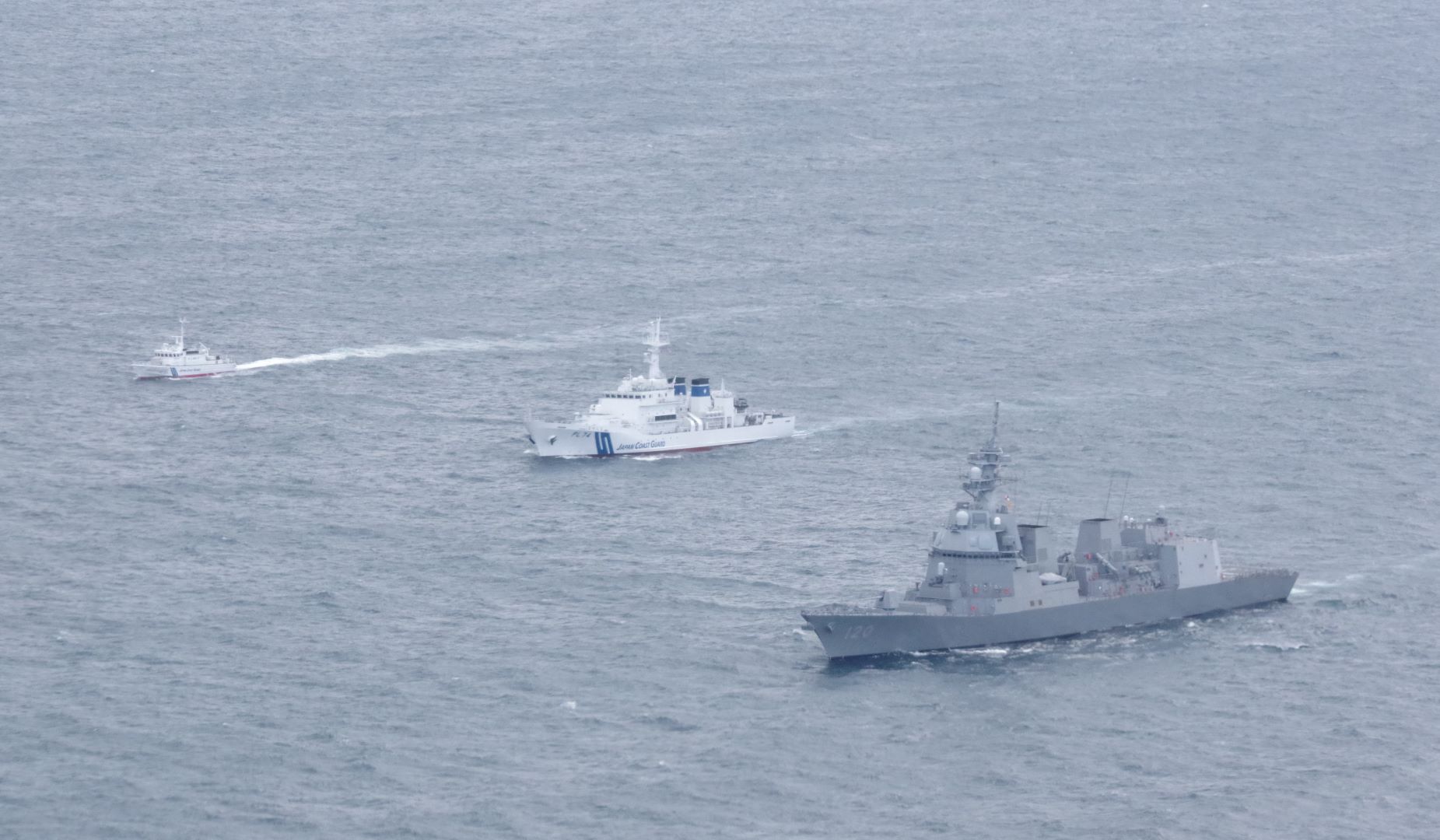 訓練時の状況(右から護衛艦しらぬい、巡視船まつしま、巡視艇うみぎり)