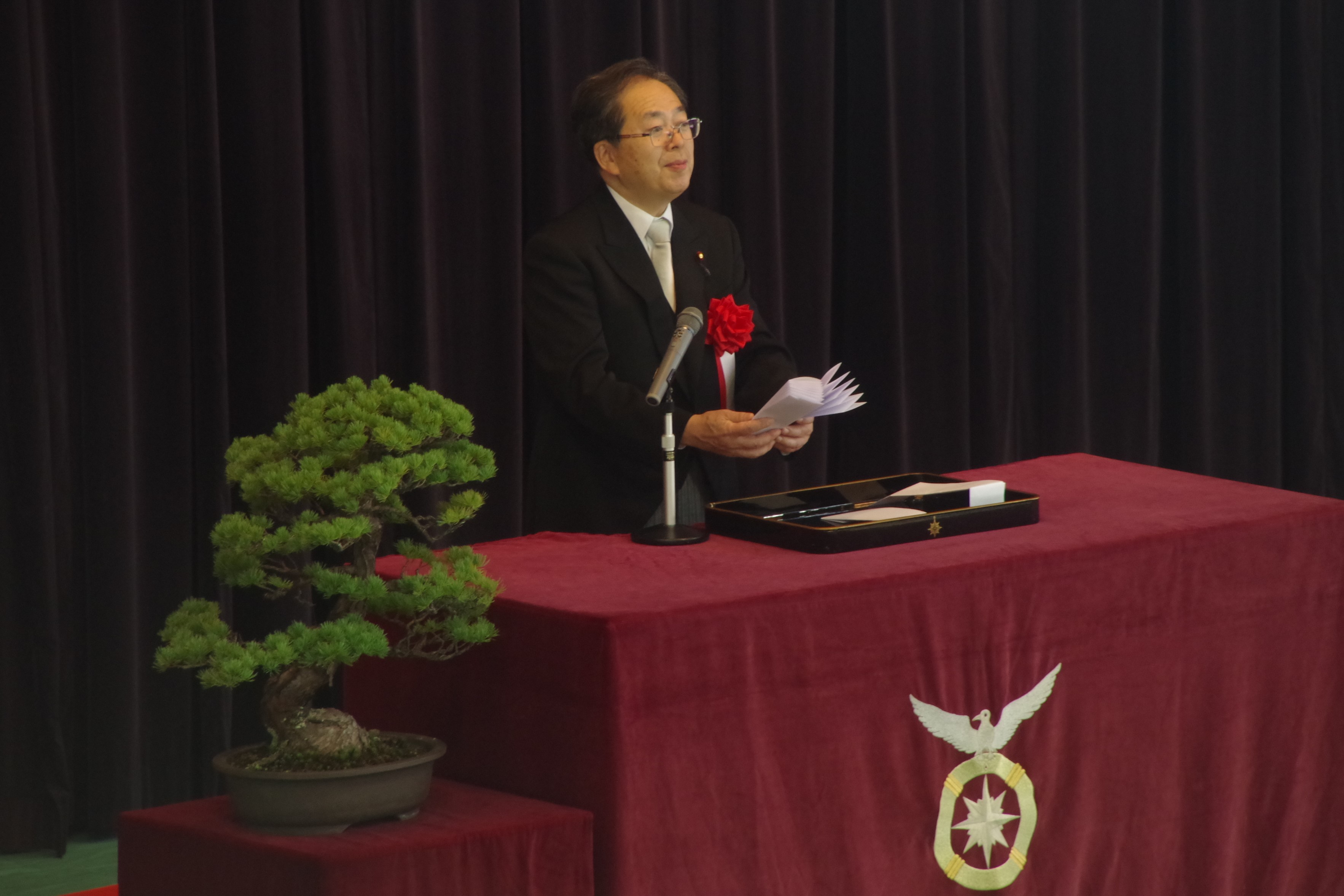 祝辞では、「私たちには、この海を守り、安全で安心して生活できる環境を次世代に継承していく責任があります。皆さんが、国民の期待に応え、国民に寄り添うことができる海上保安官として活躍されんことを大いに期待しております。」と卒業生に対する激励の言葉を述べました。