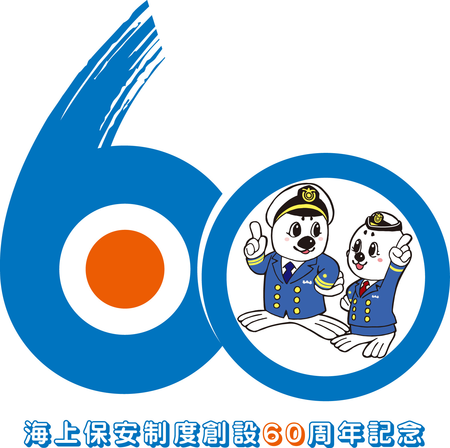創設60周年の「60」をモチーフに、海、日の丸と海上保安庁イメージキャラクター「うみまる、うーみん」を配置し、海上保安庁の歴史を力強くデザイン化